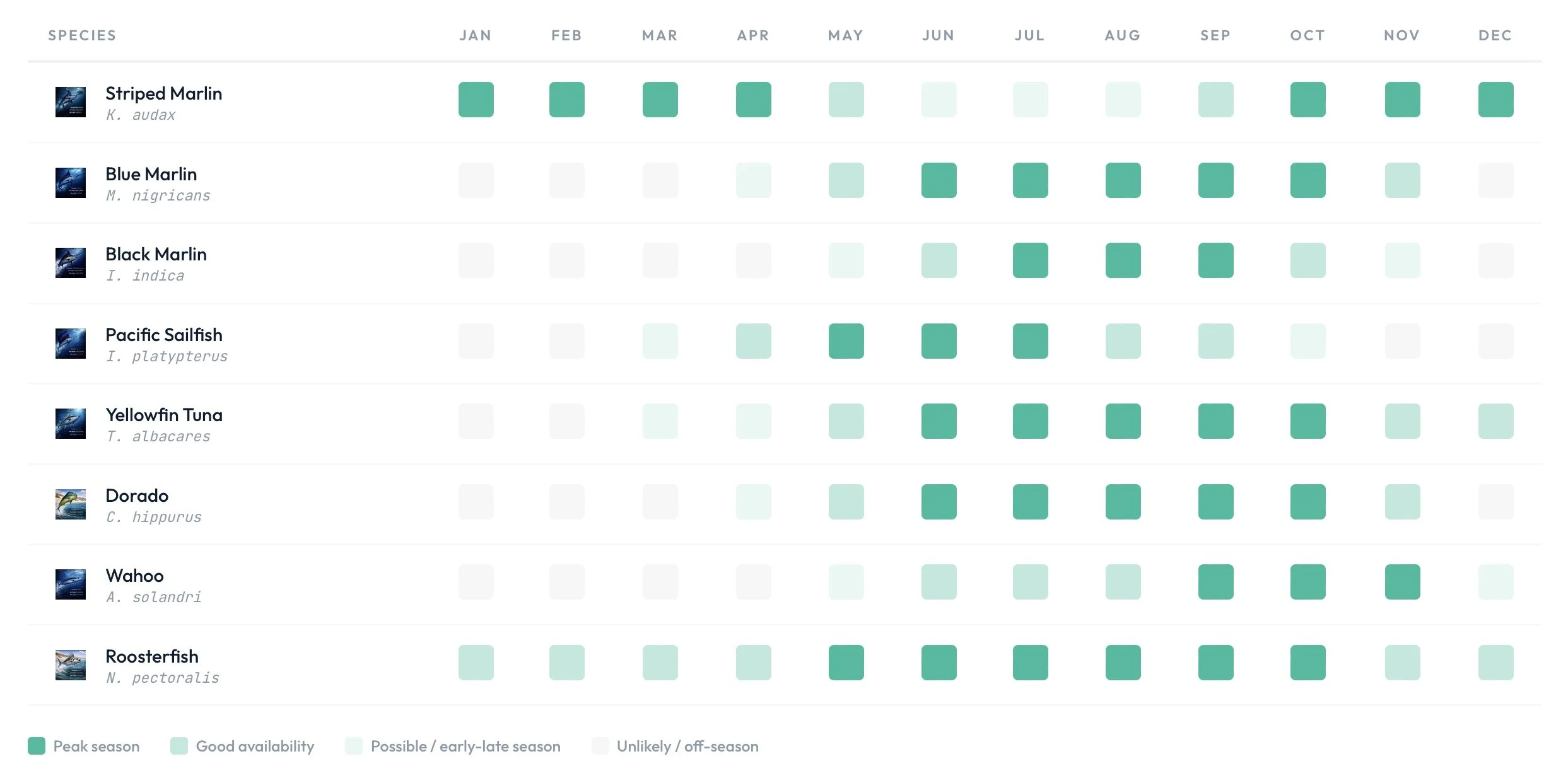 Striped marlin runs December through March, peaking in December and January. Blue marlin runs June through September, peaking in July and August. Dorado runs May through November, peaking June through September. Yellowfin tuna is available year-round, peaking May through December. Roosterfish is available year-round inshore, peaking May through October. Wahoo runs May through November, peaking September and October.